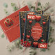 A touch of gothic, hearts and eternal connection. The design features a dark, elegant background design that immediately draws attention. Several bright red hearts, some seemingly turned into teardrops, hang from delicate, thin strings, lending the card a playful and romantic touch. The centre is dominated by an artfully designed frame with a red interior, decorated with a delicate rose pattern symbolizing love and passion. At the bottom, lush bouquets of red roses with lush greenery adorn the card, underscoring the romantic atmosphere.