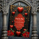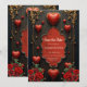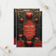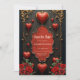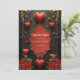 A touch of gothic, hearts and eternal connection. The design features a dark, elegant background design that immediately draws attention. Several bright red hearts, some seemingly turned into teardrops, hang from delicate, thin strings, lending the card a playful and romantic touch. The centre is dominated by an artfully designed frame with a red interior, decorated with a delicate rose pattern symbolizing love and passion. At the bottom, lush bouquets of red roses with lush greenery adorn the card, underscoring the romantic atmosphere.