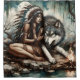 Beneath the serene moonlight, a native Indian woman sits by a flickering campfire, her flowing hair adorned with feathers. Beside her, a majestic wolf gazes intently, embodying the spirit of wild companionship