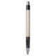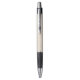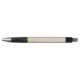 A two-panel image showing a pen with a silver tip, black grip, and textured beige barrel. The top panel displays the front view, and the bottom shows the side with a clip.