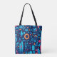 A vibrant abstract pattern composed of various geometric shapes and forms in shades of blue, pink, and orange. The composition features a mix of circles, triangles, rectangles, and other abstract elements arranged in a dynamic and visually engaging way tote bag