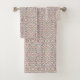 A vibrant, colorful towel hangs on a rod, featuring a psychedelic pattern of swirling shapes in pink, blue, green, and yellow. The design is lively and intricate.