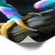 A vividly coloured reptile with a mix of vibrant hues including green, blue, yellow, and pink is perched on a piece of wood, standing out against a dark, blurred background. The detailed scales and striking eyes enhance the creature's captivating appearance.
