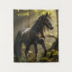 A wet black curly horse stands in a green forest. The horse's mane and tail are dripping with water, and its coat is glistening in the sunlight. The horse is standing on a patch of moss, and the trees around it are tall and lush. The forest is quiet.