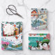 A whimsical winter scene features a lively village with colourful houses, snow-covered trees, and joyful children playing around a cheerful snowman. The sky is filled with decorative stars and snowflakes, adding to the festive atmosphere.