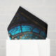A stained glass window with a mushroom cluster worked into it, beautiful soft blue hues creating a sense of calm.