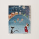 A colorful, whimsical winter scene of little girl and her adorable black cat watching gingerbread kids skating below. The work of artist Lucy Benedetti Aponte to delight the soul in a puzzle