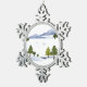 A winter wonderland scene with snow-covered trees, snowflake pewter christmas ornament
