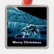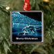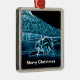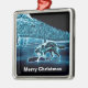 A lone wolf (Canis lupus) traverses a snowy landscape in this simple, dark, stylized image. Moonlight reflects off the snow. Customizable text reading, Merry Christmas" also appears.
