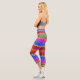 A woman wears vibrant, zigzag-patterned leggings in bold colors like magenta, blue, and orange. The lively design contrasts with her gray sneakers.