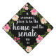 Cute feminist grad cap topper features the quote "a woman's place is in the House and the Senate" in white brush script lettering on a black background adorned with pink watercolor flowers and green foliage. Personalize with your class year and/or school.