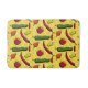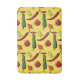 A peri-peri, friggitello, habanero, rocoto, jwala, and shishito chili pepper are decorated with patterns from the region where they were originally cultivated or are commonly eaten and sit on a yellow background with patterns inspired by tattoos worn by native peoples in the Amazon to create a fun repeating pattern that reflects the origins and spread of these tasty, and often spicy fruits.
