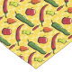 A peri-peri, friggitello, habanero, rocoto, jwala, and shishito chili pepper are decorated with patterns from the region where they were originally cultivated or are commonly eaten and sit on a yellow background with patterns inspired by tattoos worn by native peoples in the Amazon to create a fun repeating pattern that reflects the origins and spread of these tasty, and often spicy fruits.