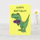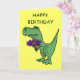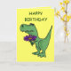 Dinosaure hilare de t-rex de bande dessinée avec un design de carte pourpre d'anniversaire de marguerite. Il est plein de la personnalité et il est mignon et drôle. Vous pouvez également ajouter votre propre texte en passant commande.