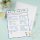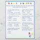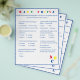 Design features a white background to a blue border and blue text. Title is displayed in bright colours. Questions are multiple choice and relate to development of Baby. The last question, however, is customizable and is personalized to the Mommy-to-Be. The stenciled letters, "ABC" are displayed at bottom, right corner in primary colours. Answers are found on back. Also available in red. Designed to coordinate with the "ABC Baby Shower Collection."