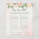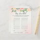 This baby shower game card features beautiful soft pastel watercolor roses and peonies in shades of blush pink and peach with lush green botanical leaves and eucalyptus.