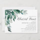Élégante répétition botanique invitation à dîner avec des feuilles d'eucalyptus vert luxuriant et feuillage illustré en aquarelle. Personnalisez avec vos détails de la répétition et de la répétition de cérémonie alignés à droite. Les invitations se retournent vers le vert de la forêt solide.