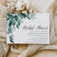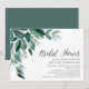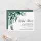 Une invitation à la douche nuptiale chic présente des feuilles d'eucalyptus vert luxuriant illustrés en aquarelle. Personnalisez avec les détails de votre douche nuptiale alignés à droite. Cartes inversées à vert de forêt solide.
