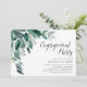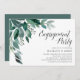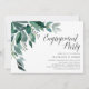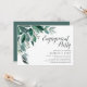 D'élégantes invitations à des fiançailles botaniques présentent des feuilles d'eucalyptus à l'aquarelle et du feuillage vert en cascade du coin supérieur gauche. Customisez avec vos détails de célébration fiançailles alignés à droite et agrémentés d'un script de calligraphie chic. Les invitations se retournent vers le vert de la forêt solide.
