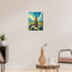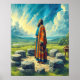 This artwork beautifully illustrates the moment from Genesis 15 when Abram gazes upward in faith, standing before a stone altar under a radiant blue sky. Clothed in flowing, colourful robes of red, orange, and white, Abram’s peaceful posture reflects his deep trust in God’s promise. The scene is enriched with lush green grass, rolling hills, and a tranquil countryside, enhancing the sacred atmosphere. Abram stands on a circular tile rock floor, surrounded by carefully placed stones, grounding him in this pivotal biblical moment. The striking landscape backdrop completes this timeless and reverent depiction.