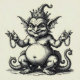 Abraxas, historically shown with a rooster head, human torso, and serpent legs, embodies the union of light, darkness, and forbidden knowledge. This fantastical engraving captures a mischievous, goblin-like hybrid with a crown, a paunchy torso, and coiling serpent legs.