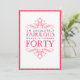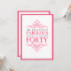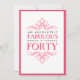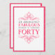 Let everyone know that the fabulous woman in your life is turning forty with this beautiful fortieth birthday party invitation in pink and white. The elegantly framed text on both front and back is accented with swirls and flourishes in a fun shade of hot pink and set against a crisp white background. All text on the back can be customized to suit your needs. Also available in a variety of colours and ages.