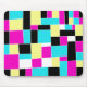 An original abstract design made up of irregular rectangles and squares in pink, yellow, cyan blue, and black.
