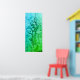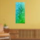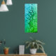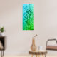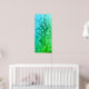 This artwork is a vertical abstract piece featuring a gradient of blues and greens. The colours transition smoothly from a deep, calming blue at the top to a vibrant green at the bottom. A distinctive white line runs straight down the centre of the piece, adding a sense of depth and division. The surface texture is rich, with circulat and organic shapes scattered throughout the, giving a sense of fluidity and movement. The overall effect is serene and reminiscent of underwater scenes or natural textures.