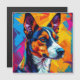 Bright and lively abstract illustration of a Basenji dog using bold colours and sharp lines. Perfect for art enthusiasts and those inspired by creative and vibrant pet portraits.
