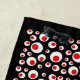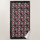 This custom beach towel has a bold abstract design in red black and red of bright red circles inside white circles on a black background.