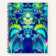 Abstract spiral notebook features fractal art in vibrant colours: blue, cyan, green, and purple. Same image is on the back side.