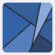 Inspired by stained glass, this stylish geometric design contains polygons in various shades of blue outlined in black. A light blue triangle slashes in from the upper right with an array of progressively darker blue quadrangles and other shapes spiralling around it from light to dark. Two dark blue shapes ground the left side of the original design.