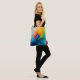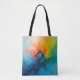 Blue, green, and orange paint combine to make a beautiful and colourful abstract design on this tote bag.