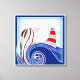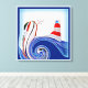 Abstract nautical artwork of a lighthouse in stormy seas with a sailing boat in a large swirly wave and seagull flying overhead. This red, white and blue sea illustration was created from my original glass painting using digital effects. Copyright Annabel Potter