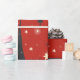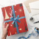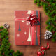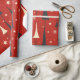 This red dominant gift wrap design features an abstract illustration of Christmas trees and star.