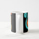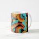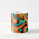 A fun and unique coffee mug that won't look like everyone else's! An abstract design of orange, gold and bright blue on a black background. The design is on all sides. Stand out in the office!
