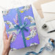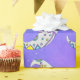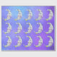 This wrapping paper has white abstract crescent moons decorated with colourful markings in blue, yellow, and purple, yellow stars with pretty faces on a mixed purple and blue sky background with dotted white stars.