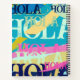 Hola text repeated in a colourful palette of blue, yellow, pink, turquoise and green.