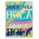 Hola text repeated in a colourful palette of blue, yellow, pink, turquoise and green.