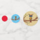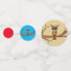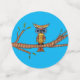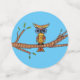 This table confetti has an abstract colourful owl with big blue eyes sitting on a tree branch with green leaves. Big circles have tan background, medium circles have blue background and small circles are plain bright red.