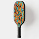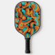 A fun and unique pickleball paddle that won't look like everyone else's! An abstract design of orange, gold and bright blue on a black background. The design is on both sides of the paddle. Stand out on the court!