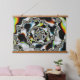 This hanging tapestry features an abstract psychedelic spiral fractal art in black and white with yellow, orange, blue, and green accents.