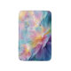 The image features a close-up of abstract floral forms in pastel colours. The petals blend shades of pink, blue, yellow, and purple, creating a soft, dreamlike quality. The centres of the flowers glow with a bright, golden light. Water droplets are scattered across the petals, adding a touch of realism. The background is blurred, enhancing the focus on the delicate floral details.