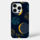 Fun abstract pattern of moon and stars on a dark blue background with printed gold foil accents.