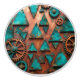 A distressed copper patina background, showcasing a blend of turquoise, burnt orange, and earthy brown hues, adorned with triangles and round gears in varying sizes.
