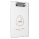Chic clipboard features your initial(s) or monogram in calligraphy script inside a faux rose gold foil abstract circle element on a crisp white background. Personalize with two lines of custom text beneath. Design repeats on reverse side.