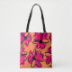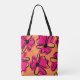 This abstract floral tote bag features a vibrant all-over pattern inspired by retro flowers and modern art. With its striking pink and orange tones and expressive black outlines, this tote is designed to stand out and elevate any outfit.