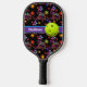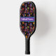 Be the envy of all the Pickleball ladies with this abstract floral pickleball paddle in black with brightly coloured abstract flowers, swirls, and circles in a variety of colours like green, pink, purple, blue, red, yellow, orange, and burgundy with a purple and blue band across the centre that has customizable wording on both sides. The front says, "Pickleball Princess" and the back is personalized with your name that sits beside a neon green pickleball that can be removed if you prefer. Email niteowlstudio@gmail.com with any request for changes.