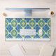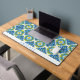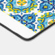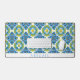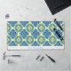 Abstract geometric Mediterranean blue and yellow tile pattern desk mat. This desk mat showcases a captivating abstract geometric pattern of Mediterranean blue and yellow tiles, creating a vibrant and inspiring workspace. The intricate design, rendered with a watercolor effect, brings an artistic touch to your desk, serving as both a functional surface and a beautiful focal point. Not only does it protect your desk, but it also adds a touch of personality. A clean white band along the bottom provides an opportunity for personalization, allowing you to add your name or a favourite quote. This desk mat offers the perfect blend of practicality and artistic flair, elevating your everyday work experience.