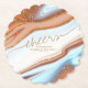 This wedding design set, with it's abstract pattern of flowing ripples and veins of glittering gold, brings to mind eye-catching rock formations and Southwestern landscapes. A colourful palette in shades from rust, and terra cotta through sky blue adds to the appeal. The coordinating paper coaster shown here has an abstract background holding optional text of 'Cheers to the happy couple' along with your names and wedding date. Search ID903 to see other colour choices and coordinating pieces for this unique wedding collection.